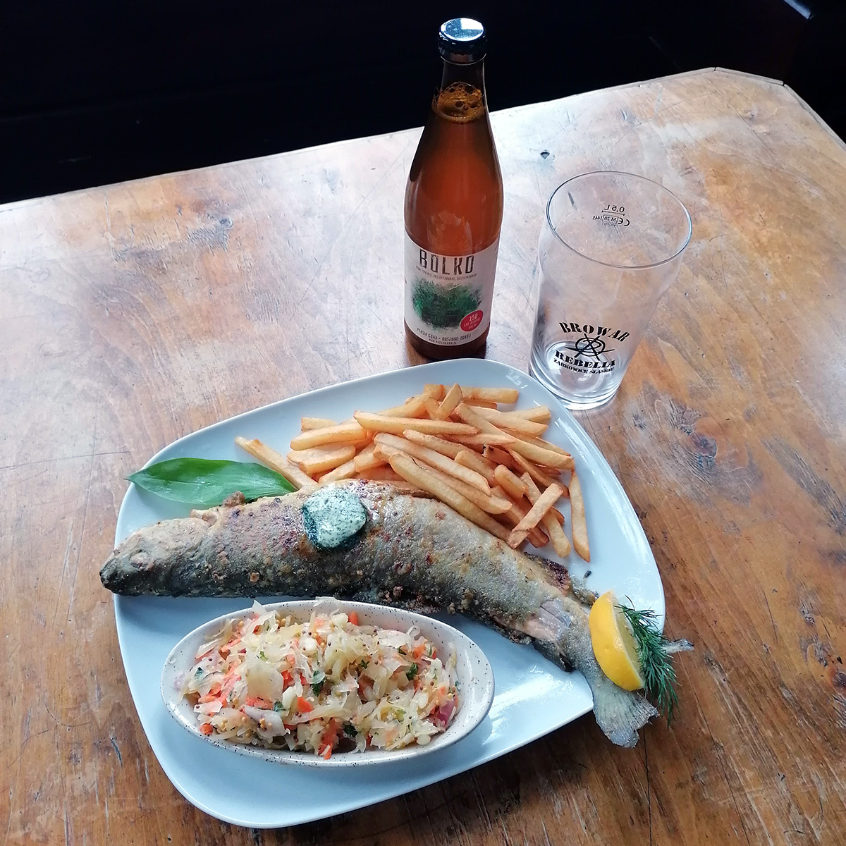 frytki, surówka z kiszonej kapusty, czosnek niedźwiedzi, masło koperkowe